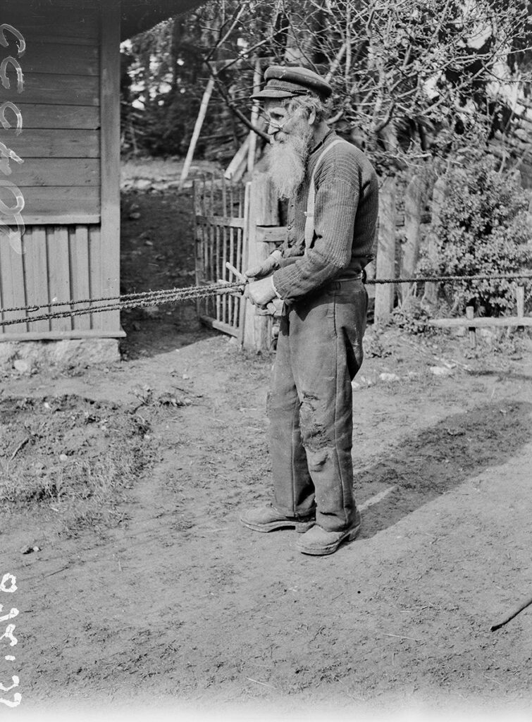 Köie kokkulöömine, vana mees korraldab puuhargiga köie keesid. Kõlaja t, Lätiniidi k, Tagamõisa, Kihelkonna khk. Pildil on Sander/Aleksander Kannel (1865–1946), meresõidutunnistuse omanik, Jüri Tulgi vanavanaisa. Foto Gustav Ränk, 1940. ERM Fk 892:35