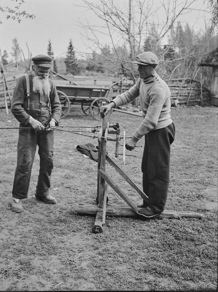 Kirjeldustõlge: mustvalgel fotol töötavad köiemasinaga habeme ja prillidega mees ja soniga mees.