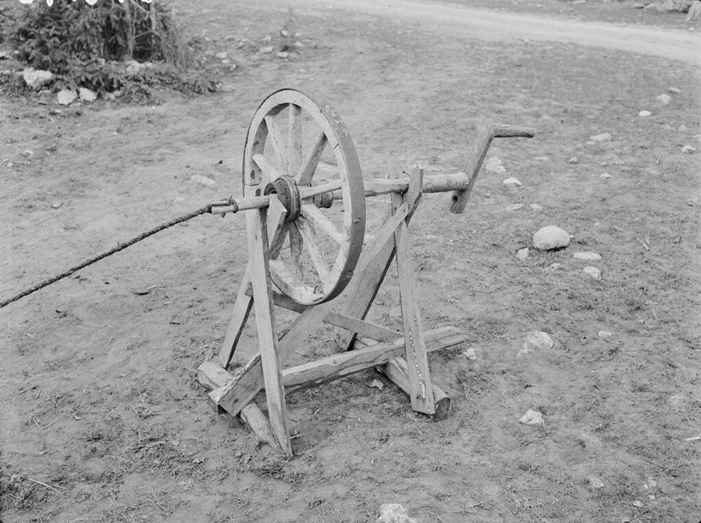Kirjeldustõlge: mustvalge foto õues seisvast köiemasinast: puidust konstruktsioon ratta ja vändaga.