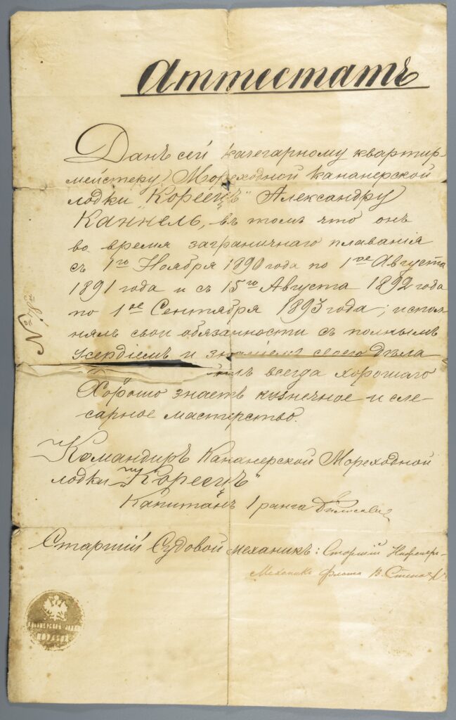 Antud kahuripaadi „Korejets“ katlakütja-kortermeistrile Aleksander Kannelile selle eest, et ta välismaisel mereretkel 1. novembrist 1890 kuni 1. augustini 1891 ja 15. augustist 1892 kuni 1. septembrini 1893 täitis täpselt oma kohustusi, täieliku pühendumisega ja alati hästi. Tunneb hästi sepa- ja lukksepatööd.