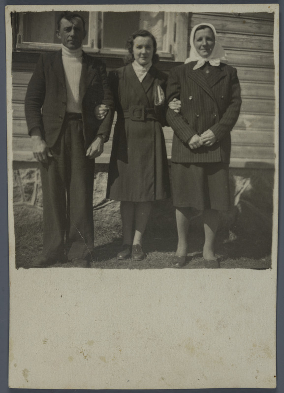 Kirjeldustõlge: mustvalgel fotol on kolmekesi kõrvuti seismas mees ja kaks naist. Keskel seisev noor naine hoiab mehel ja naisel käevangust kinni.