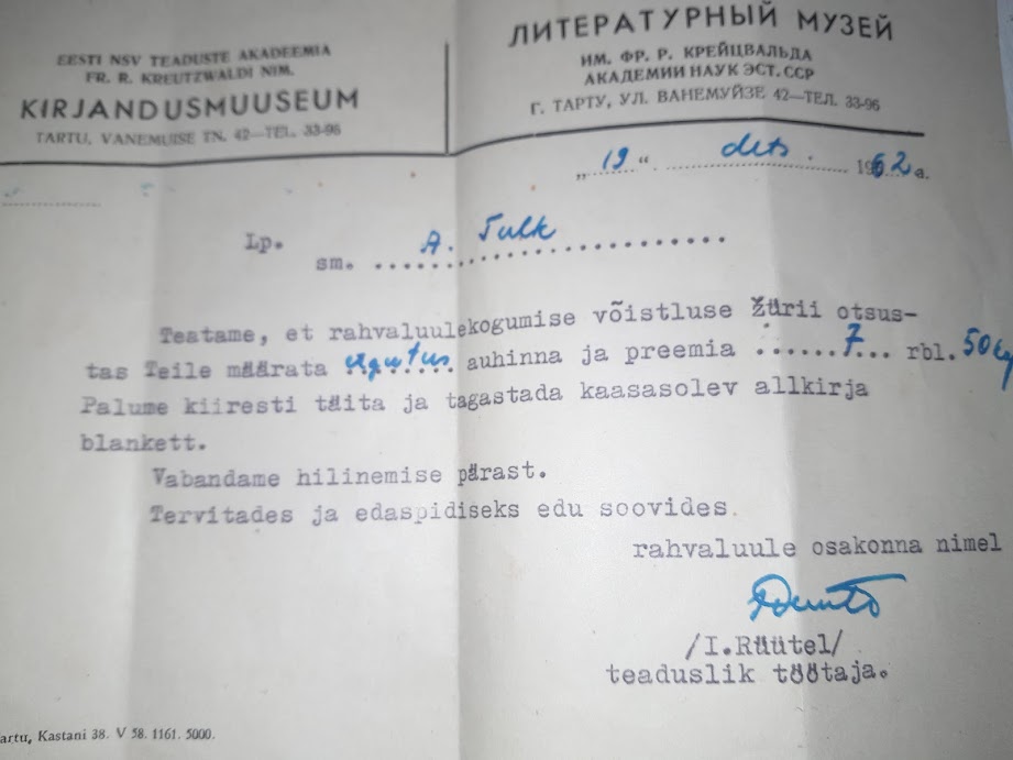 Kirjandusmuuseumi saadetud teade rahalise preemia määramise kohta Aino Tulgile rahvaluulekogumise võistlusel. Dokument Jüri Tulgi valduses.