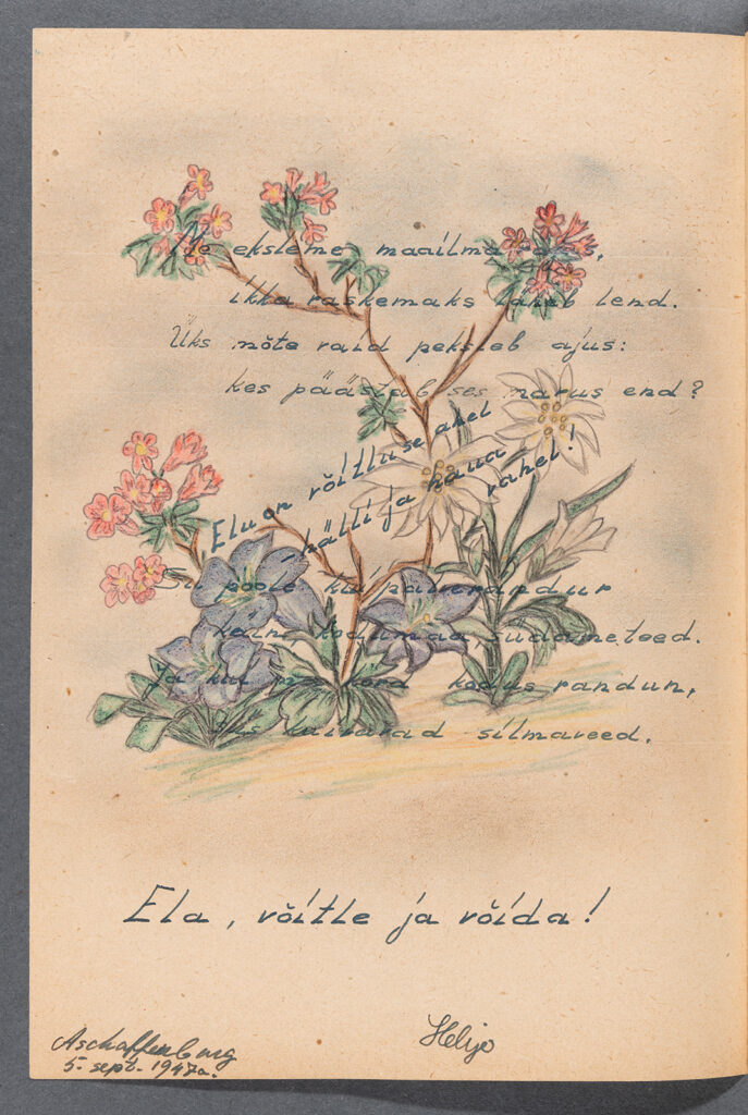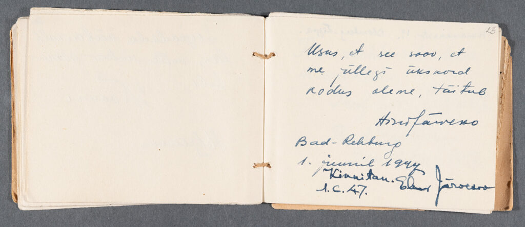 Vaatame ka pagulaseestlaste salmivihikuid. Lia Nõukaselt (s 1932) on arhiivis neli salmikut. Esimene on tema enda tehtud vihik Kaiserslauterni laagrist. Tema salmikutes on nii tuttavaid värsiridu eestlaseks olemisest, laulusõnu kui ka tõsisemaid koduigatsust ning karmi reaalsust tunnistavaid salme: