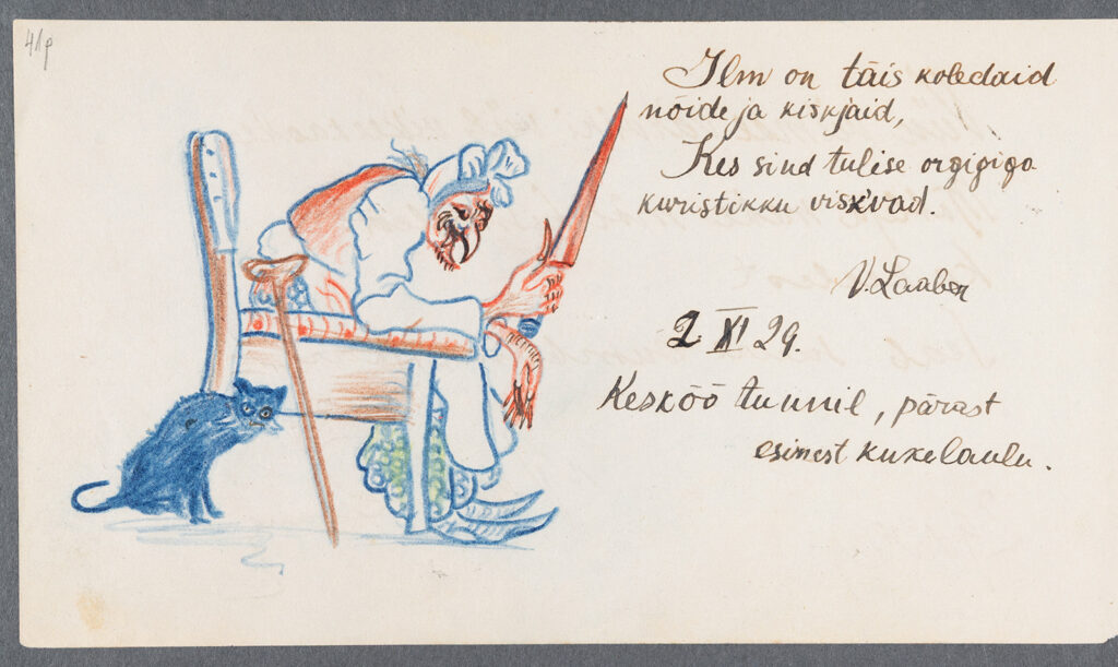 Nende salmide puhul ei tea, kas kirjutajateks olid poisid või tegid sõbrad vimkasid, kirjutades salmikutesse tollal populaarseid vemmalvärsse. Ka järgneva humoorika ning veidi sünge nõia ja musta kassiga pildilt võib välja lugeda krutskit.