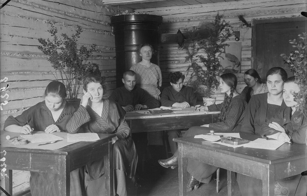 Kirjeldustõlge: mustvalgel fotol on grupp mehi ja naisi laudade taga kirjutamas.
