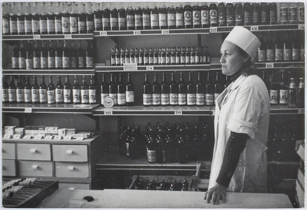 Kirjeldustõlge: mustvalgel fotol seisab leti taga tõsise ilmega naine, kellel on seljas valge kittel ja peas müts.
