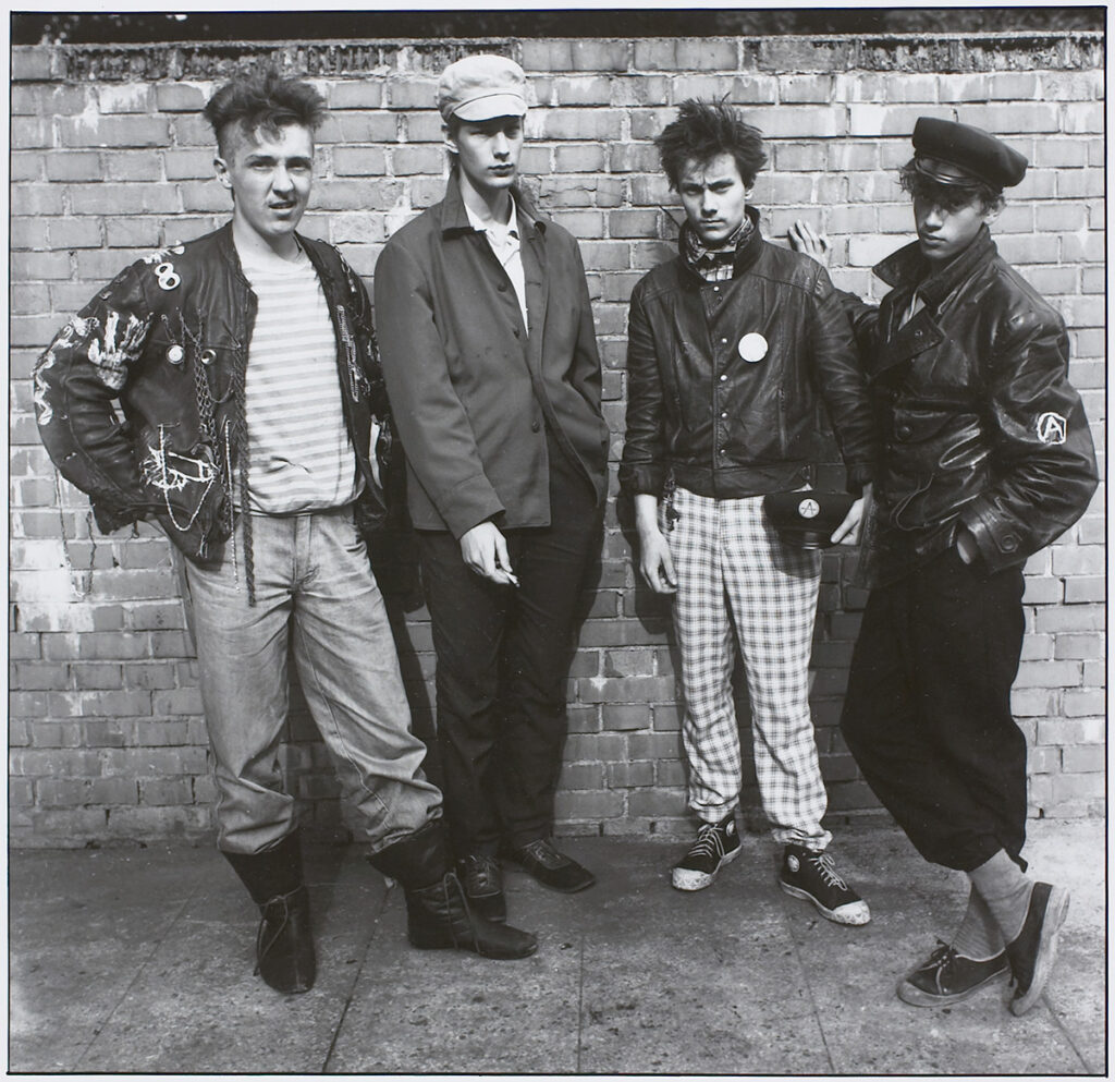 Kirjeldustõlge: mustvalgel fotol seisab telliskividest seina ääres neli meespunkarit.