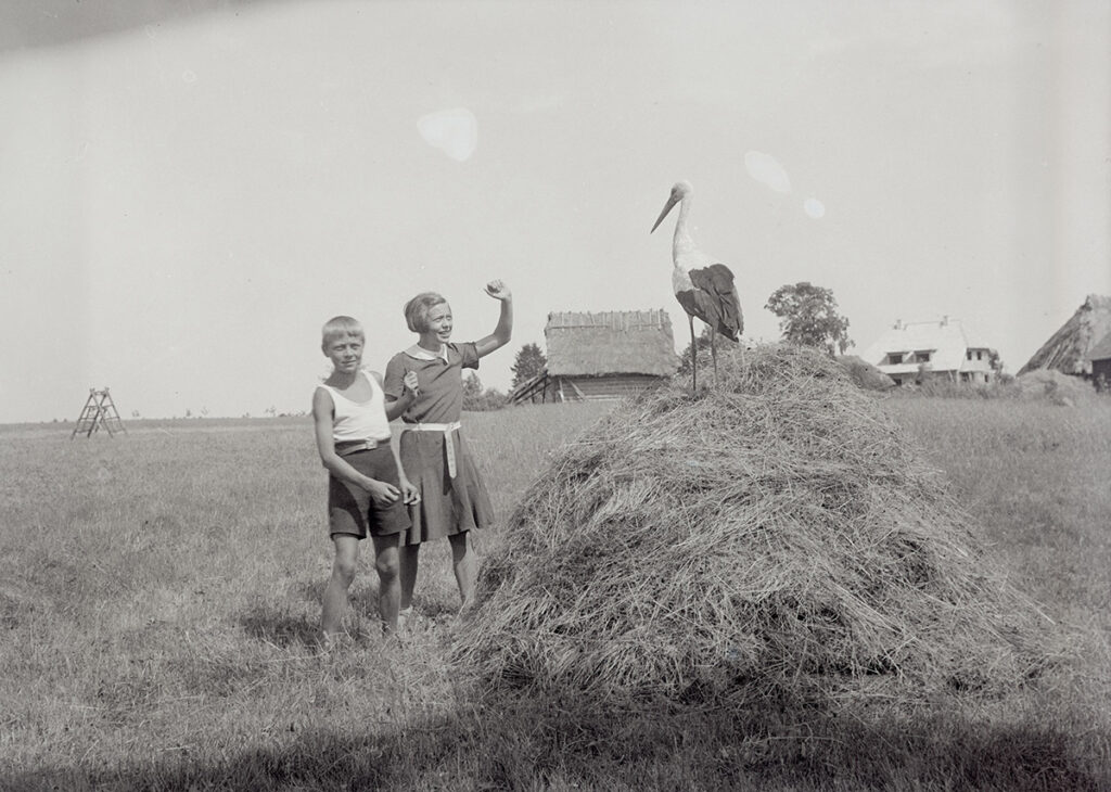 Kirjeldustõlge: Must-valgel fotol on heinamaal poiss, tüdruk ja heinahunniku otsas seisev toonekurg.