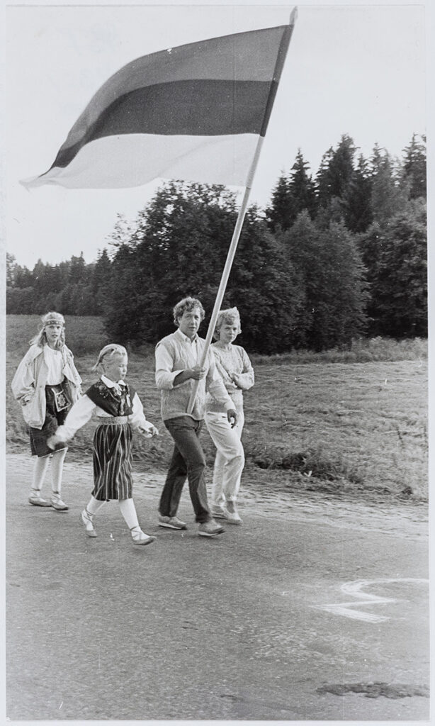 Kirjeldustõlge: mustvalgel suvisel fotol kõnnivad mees, naine ja rahvariietes lapsed. Mees hoiab käes suurt sinimustvalget lippu.