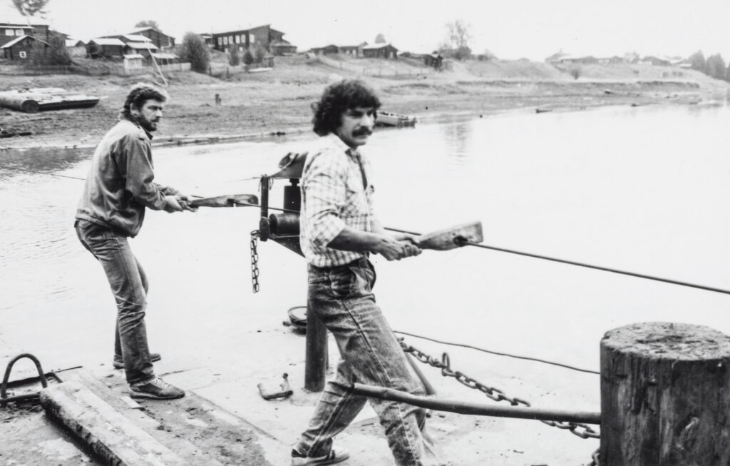 ERMi töötaja Heiki Pärdi ja Komi Koduloomuuseumi bussijuht Slava parve üle jõe vedamas, 1989. Foto: Aldo Luud. ERM Fk 2327:182